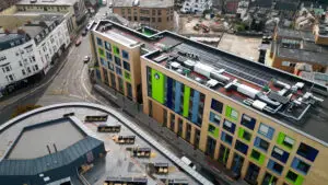 The scheme dispenses with fossil fuel gas heating, instead a centralised air source heat pump system with low temperature distribution serves all the apartments where each unit has a water to water heat pump.
