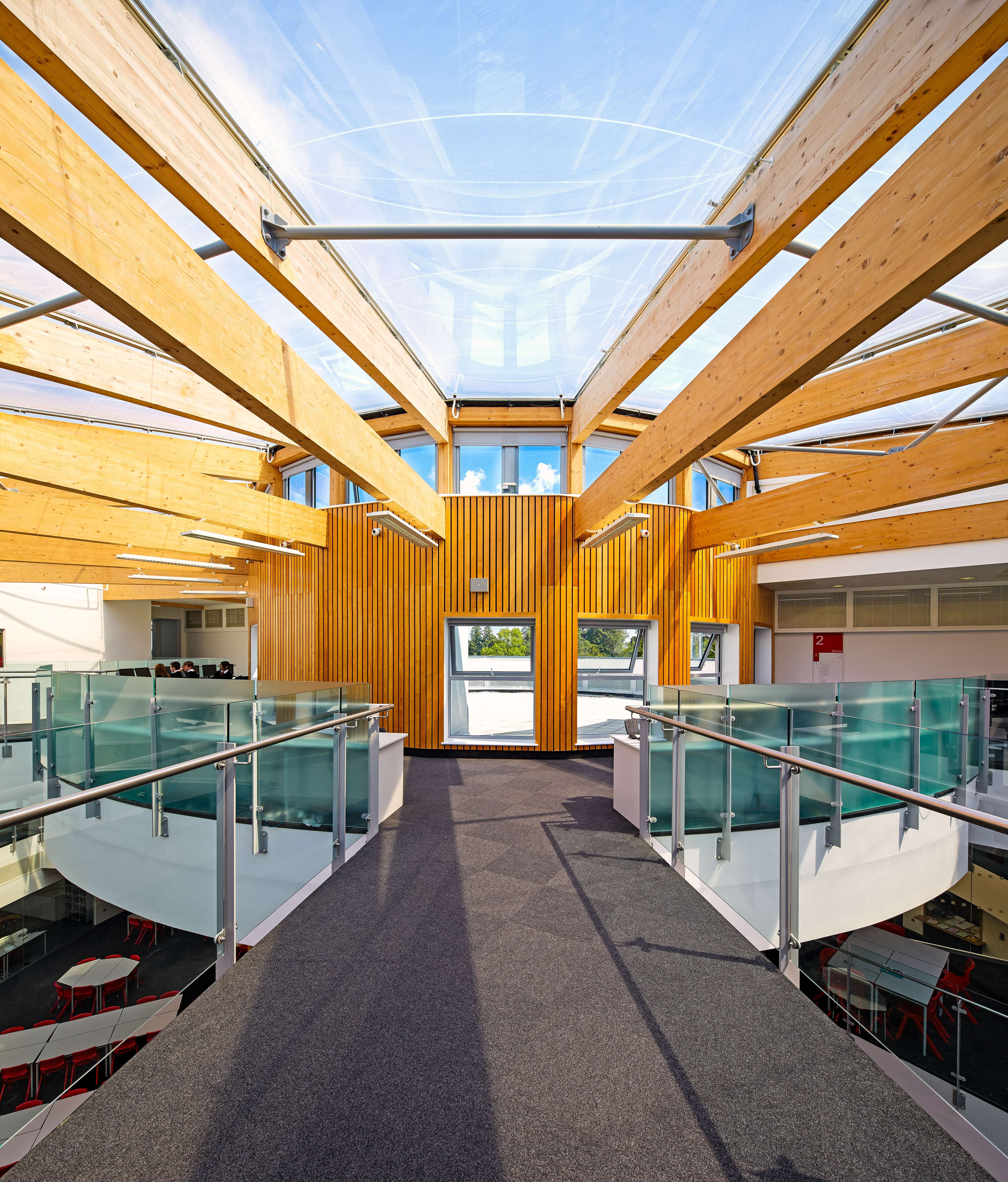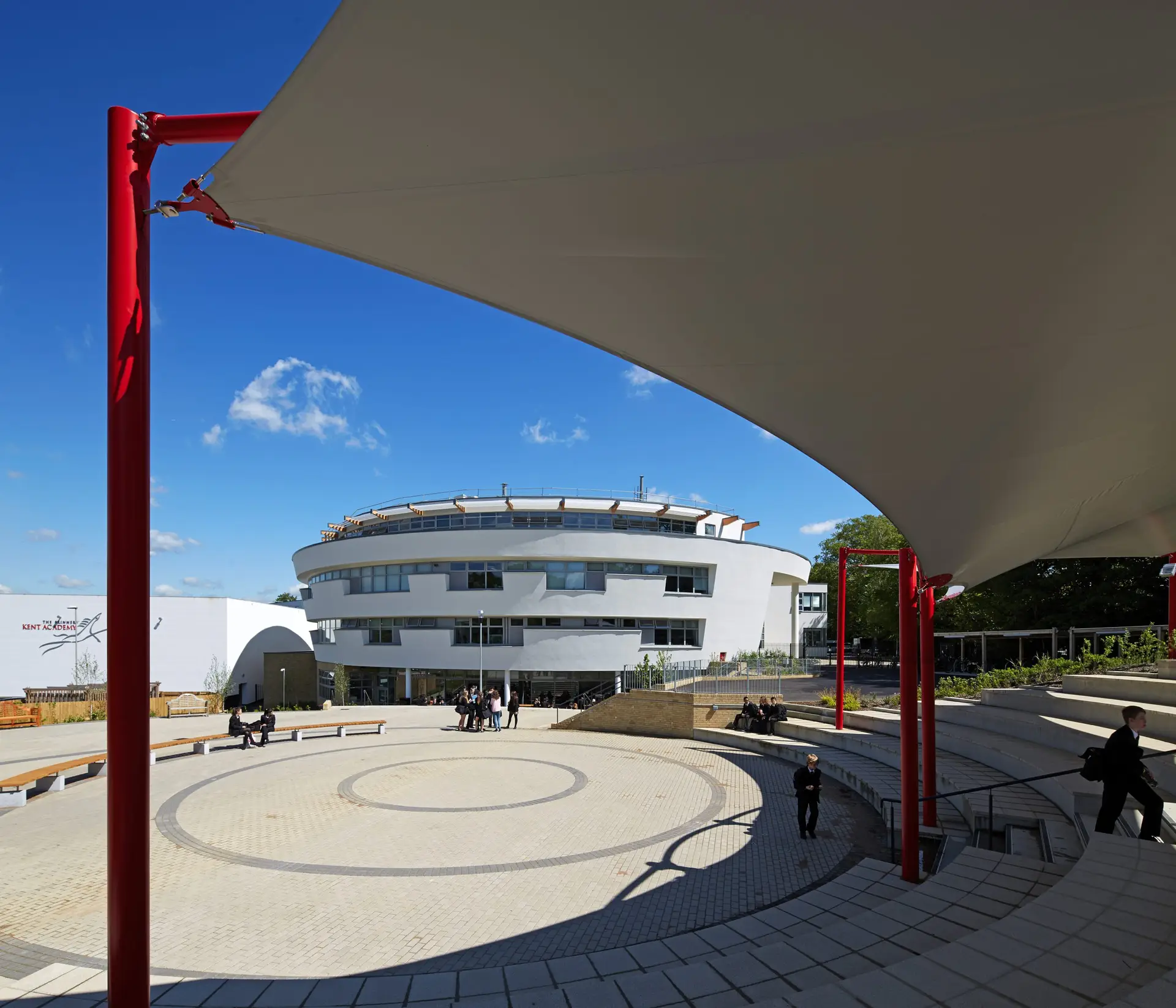 The central swept conical form of the building extends out northwards with three articulated wings providing the senior houses of the school.